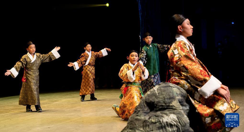 西藏首部少儿舞台剧藏戏《顿月顿珠》演出现场,罗桑朗觉(右三)在剧中饰演“顿月”(2月11日摄)。新华社记者 丁增尼达 摄